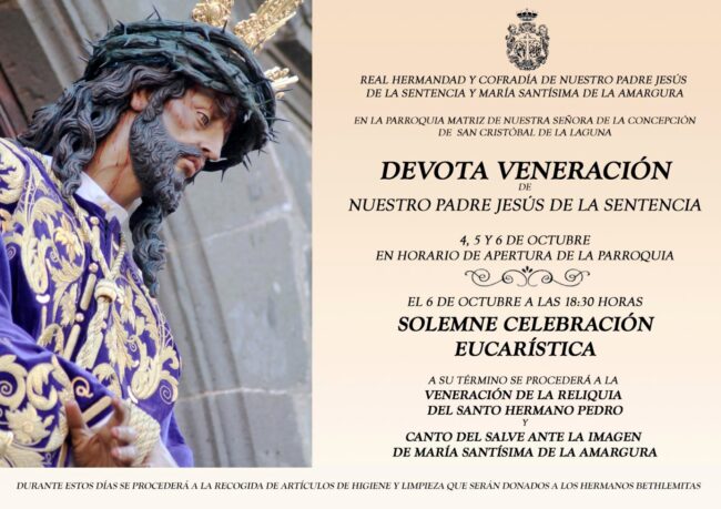 El martes 8 de octubre a las 19 horas, en la Parroquia de Santo Domingo de San Cristóbal de La Laguna, la JHC y la Cofradía de la Misericordia, ofrecen una Eucaristía por el eterno descanso a Dª Celestina Albelo Hernández, que fue miembro del Comité Ejecutivo de la Junta de Hermandades y Cofradías, y…