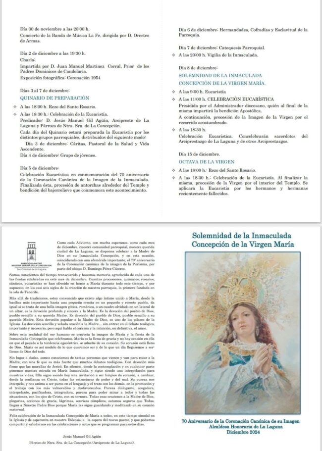 Programa del 70 Aniversario d ela Coronación Canónica de la Inmaculada Concepción NoticiasPor Junta de Hermandades y Cofradías San Cristóbal de La Laguna2 diciembre, 2024