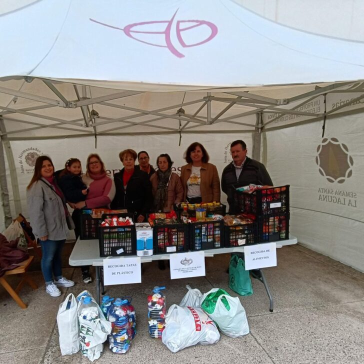 En la Plaza de Los Remedios, la Cofradía de la Entrada de Jesús en Jerusalén ha hecho su obra social con la recogida de alimentos y tapones para aquellas personas más necesitadas.