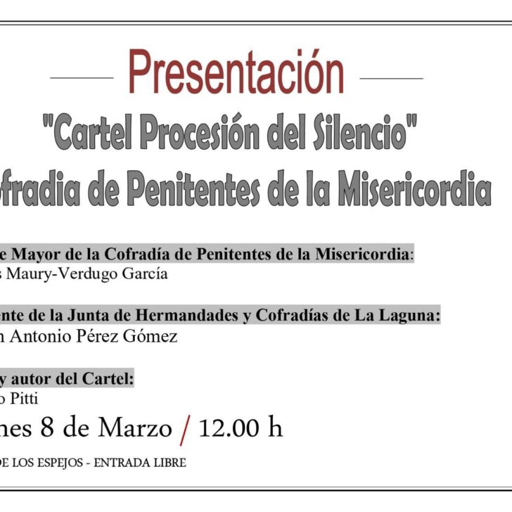 El próximo viernes, día 8 a las 12 horas, en el casino de La Laguna será presentado por la Cofradía de Penitentes de la Misericordia, el Cartel de la Procesión del Silencio.