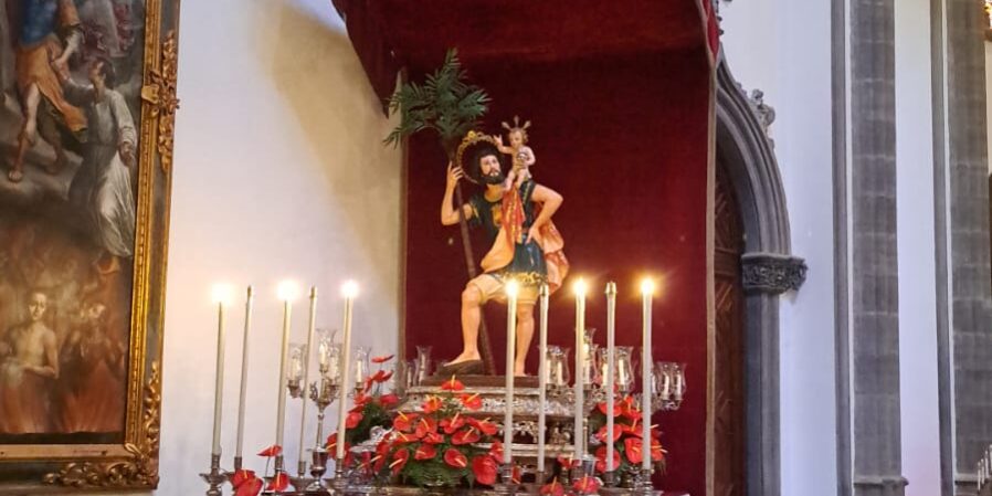 A las 17:30 horas, dio comienzo la solemne celebración eucarística en honor de San Cristóbal en la Santa Iglesia Catedral, presidida por el Muy Ilustre Sr. D. Miguel Ángel Navarro Mederos, Canónigo de la Catedral y con la asistencia de autoridades civiles y de los cuerpos de seguridad local y nacional.