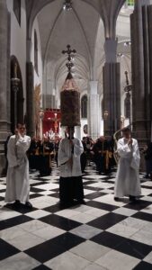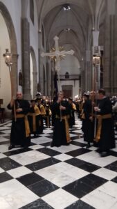 Finalizada la misma, y como consecuencia de las inclemencias meteorológicas que no han permitido procesionar por las calles de nuestra ciudad, se ha procedido a realizar la procesión claustral de la sagrada imagen, acompañada por la Hermandad de Nuestra Señora de la Cinta y del Santísimo Cristo de Burgos.