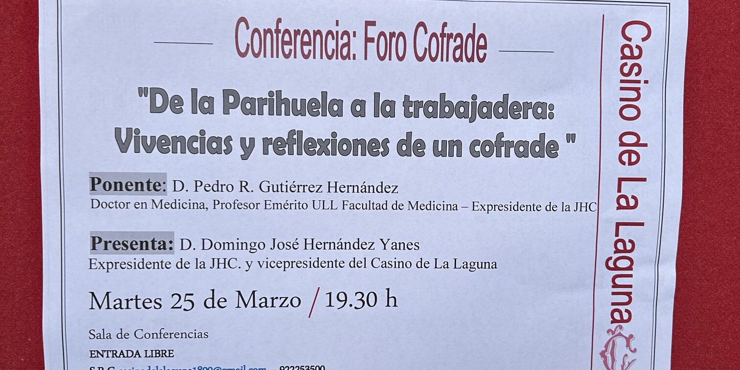 Casino de La Laguna. Martes 25 de marzo. 19:30 Vivencias cofrades: de la parihuela a a trabajadera. A cargo de Pedro R Gutiérrez. Presentación: Domingo Hernández Yanes.