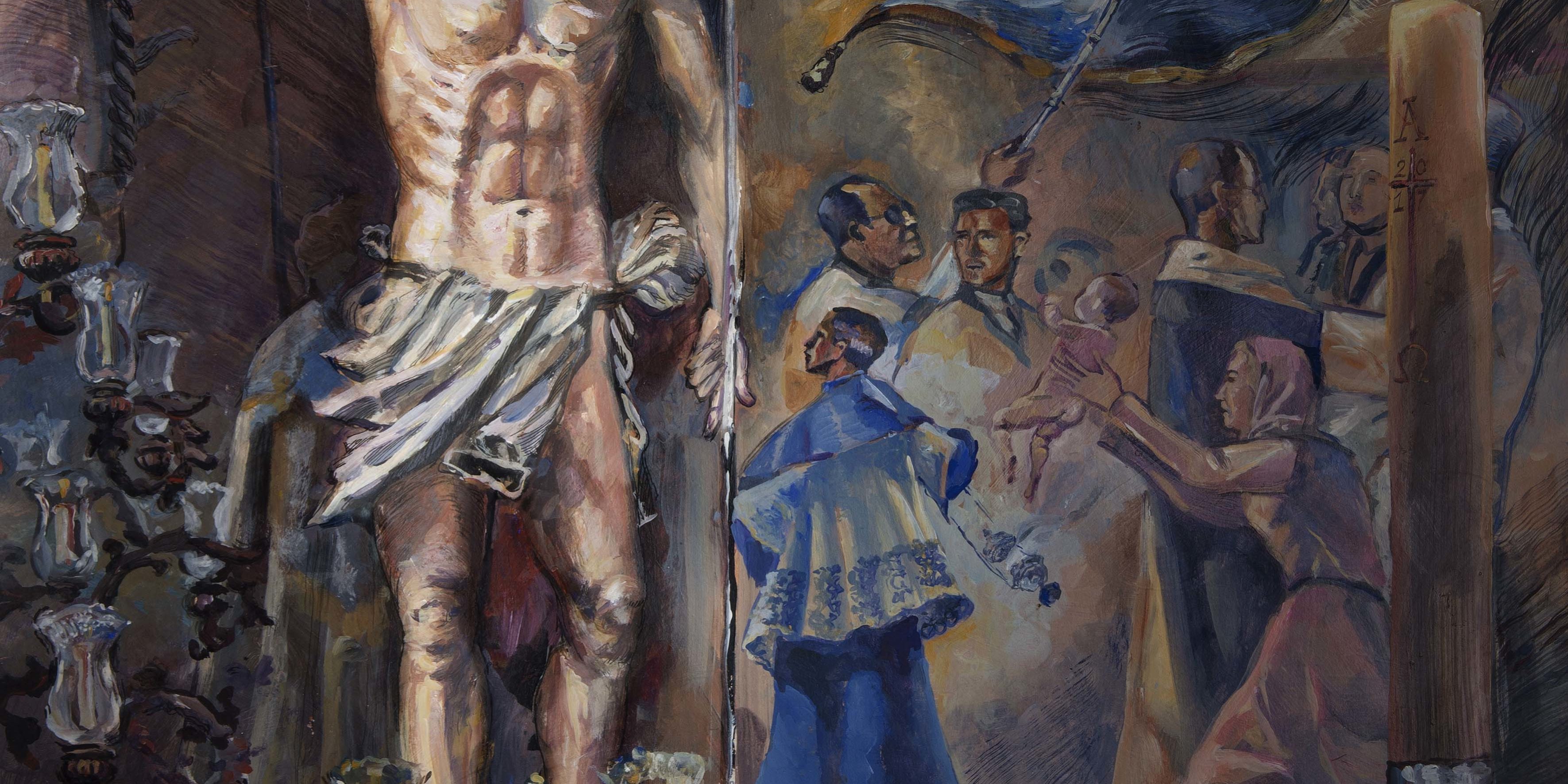 Al autor le ha parecido muy sugerente el paso del Señor Resucitado por la nave de la parroquia de Santo Domingo, avanzando muy cerca de las pinturas de Mariano de Cossío. En estos murales se representa al pueblo lagunero en actitud de recibir a la Virgen de Candelaria, en una de las traídas de la imagen a la ciudad. En el caso del cartel, la multitud de hombres y mujeres parecen recibir y acompañar al Cristo, como un verdadero símbolo de vida. Se destaca entre ellos a la madre que ofrece un niño casi recién nacido y a un joven monaguillo, ambos representan la vida nueva. La gloria que significa la santidad de la Virgen de Candelaria, cuyo trono se entrevé en un extremo, refuerza el concepto de la Resurrección. Junto al Cristo Resucitado y a las pinturas murales, aparece un Cirio Pascual, la gran vela que se bendice en cada parroquia la noche de la Vigilia Pascual y que preside las celebraciones sacramentales durante un año.
