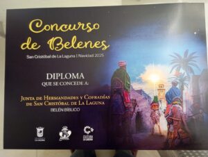 Aunque el Belén de la JHC está fuera de concurso se nos distinguió con un diploma y obsequio que fue recogido por nuestro Presidente, D. Juan Antonio Pérez Gómez.