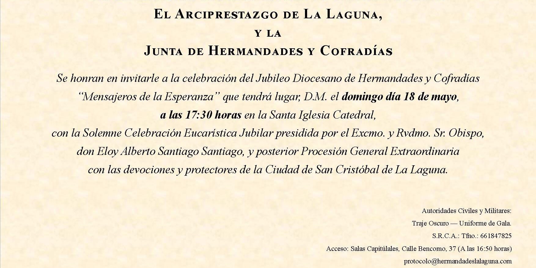 El Presidente de la Junta de Hermandades y Cofradías de La Laguna y su Comité Ejecutivo, junto a la Delegación Diocesana para la Piedad Popular tienen el honor de invitarle a la celebración del Jubileo Diocesano de Hermandades y Cofradías “Mensajeros de la Esperanza”.