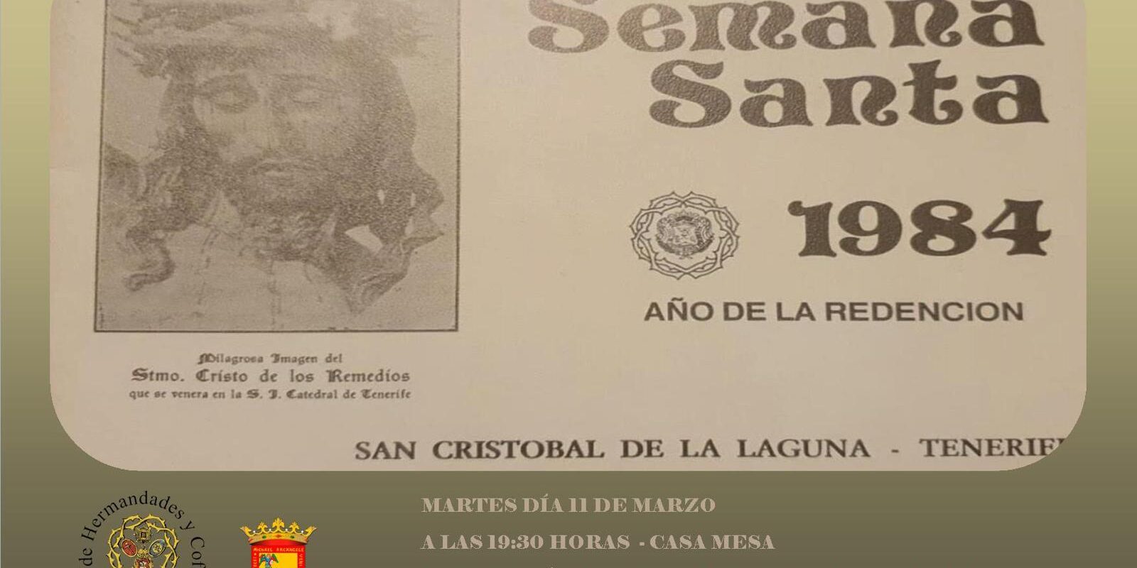 El próximo martes, día 11 de marzo, en la Casa Mesa a las 19:30 horas, se proyectara “La Semana Santa Lagunera de 1984”, película de D. Bonfilio Marrero Salas. Presentara el acto D. Antonio Regalado Díaz.